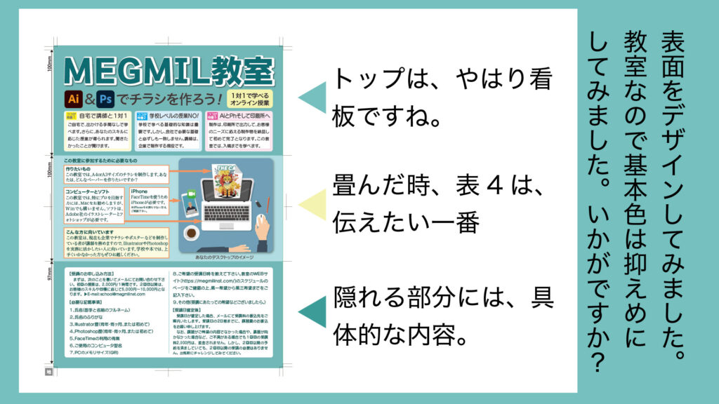 折り畳んだ時、表面は上のような感じですので、チラシを手に取った印象は上と2段目(表4)の印象が強く出るでます。チラシやパンフレットの対象となるお客様への第一印象がここで決まります。そんな訳で、作ってみたのが下のチラシです。