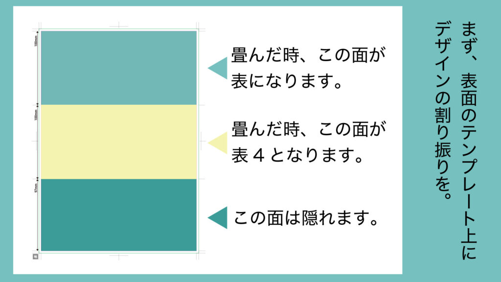 今回は、A4の1/3仕上り巻3つのチラシのデザインをしてみます。前回のラクスルのテンプレートを使いましょう。巻3つは、上のような折り方をします。畳むと表面の上段と中段が表裏となりますので、まずそのことを考慮して、表面の各段のデザインを考えましょう。